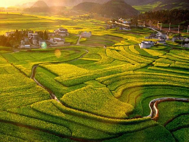 冬春季節(jié),長(zhǎng)滿油菜花的地塊金光燦爛,長(zhǎng)著小麥的地塊碧綠如玉;通過(guò)時(shí)候,沿著園周梯田一圈圈往上延伸的多是開(kāi)滿油菜花的,像無(wú)數(shù)金龍盤臥。還有的弓形、半園形的梯田,多的十幾級(jí)、少的三四級(jí),而且各種形狀相鑲,其間隔有一兩塊裝滿水的閑田如明鏡置于其中,一排排翠綠的樹(shù)點(diǎn)綴,形成了色彩鮮明、線條優(yōu)美、奇妙無(wú)比的美景。
