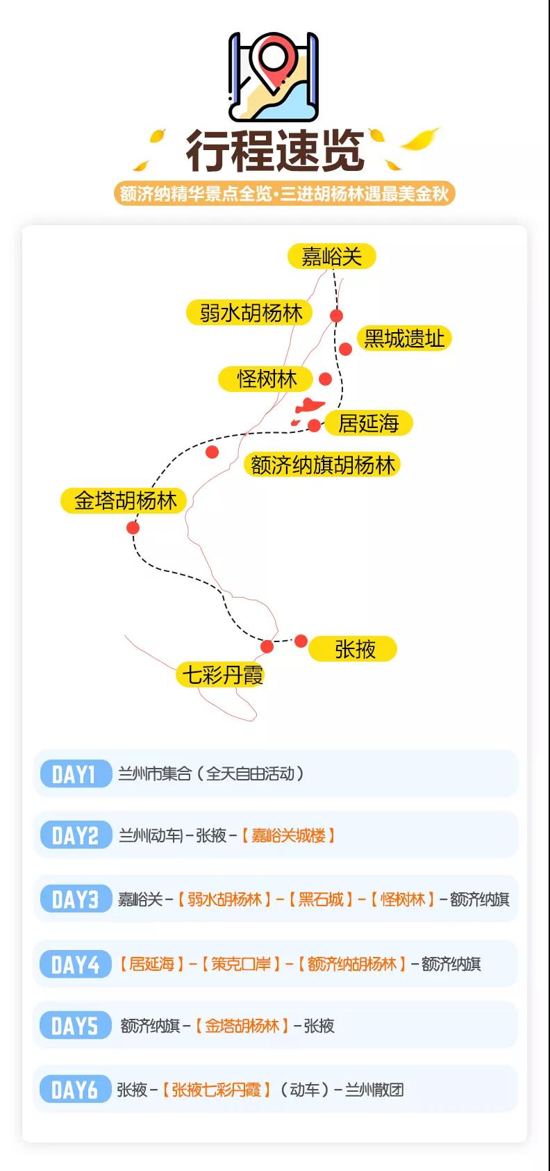 門票:含額濟納胡楊林、黑城-怪樹林-弱水胡楊林門票(含景區(qū)交通車)、居延海(含景區(qū)交通車)、張掖七彩丹霞地貌(含景區(qū)交通車)、嘉峪關(guān)城樓門票、策克口岸門票。