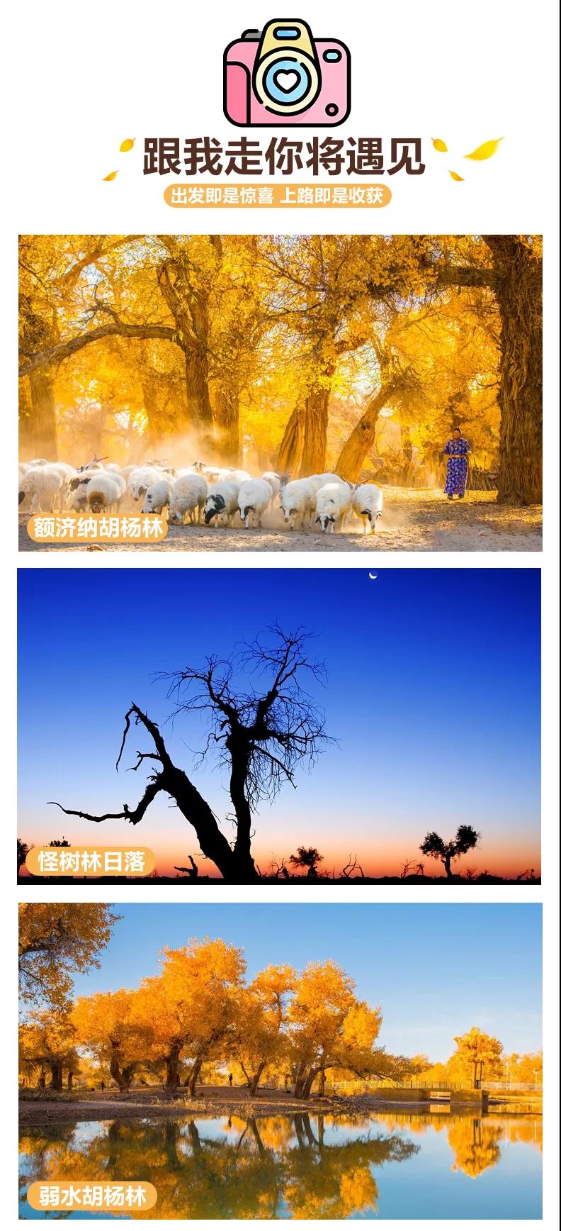 隨后我們在【額濟納胡楊林景區(qū)】中自行游玩攝影創(chuàng)作,胡楊有“生而一千年不死,死而一千年不倒,倒而一千年不朽”的說法,被世人稱為英雄樹。千姿百態(tài)的胡楊遍布在沙漠中,漫步輝煌的金秋胡楊林,用鏡頭記錄這中國最美的秋景;或者去找尋導(dǎo)游所說的一樹三葉的神奇景象——“幼樹葉如針?biāo)屏肌妖g樹葉酷似白樺、老年樹葉橢圓”,胡楊、藍(lán)天、來自大漠腹地的風(fēng)聲襲來之時,胡楊林便泛起黃澄澄的層層漣漪,顯盡大西北秋冬那紅盛翠減的獨有風(fēng)情。張藝謀的大片《英雄》中張曼玉與章子怡身著紅衣在這漫天的金色胡楊中打斗,踱步在胡楊林,熒屏內(nèi)的唯美畫面一一浮現(xiàn)。