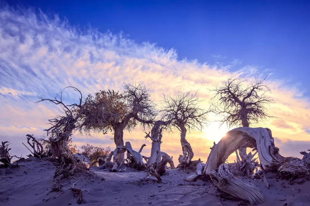 隨后我們游覽約一小時【怪樹林】,這里幾十年前是一片原始森林,由于水源不足等自然因素,大面積的胡楊樹木枯死。如今,枯木東倒西歪,神態(tài)各異,因此當(dāng)?shù)厝朔Q之為怪樹林。我們將在怪樹林欣賞大漠落日,看滾滾落日從地平線上姍姍落下,形態(tài)各異的枯枝在大漠上畫出蜿蜒的影子。