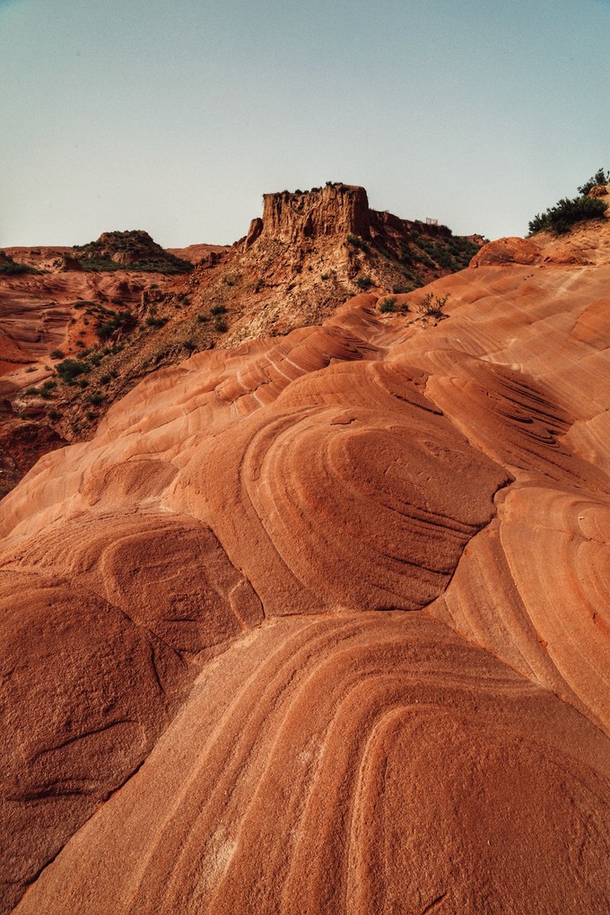 從B停車(chē)場(chǎng)出發(fā),沿小路向前走不多遠(yuǎn),前面就能看到幾個(gè)丹霞紅砂巖山丘,右手邊是土橋和大灣畔兩個(gè)水庫(kù)中間的一個(gè)過(guò)渡的水塘。在半島西北角的山坡下邊有一片水浪波紋的紅砂巖,這里是這個(gè)區(qū)域最驚艷的地方,不僅可以看到碧水藍(lán)天,還能夠眺望對(duì)面大面積的丹霞紅石,最重要的是可以近距離接觸大片波浪紋路的紅砂巖。