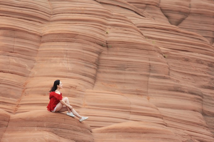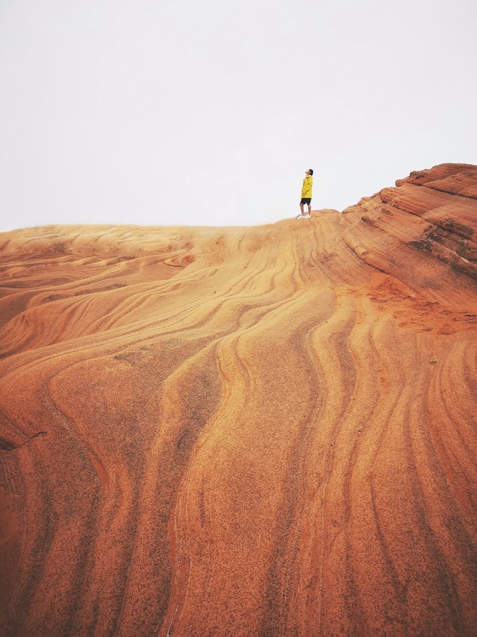 波浪谷狀的丹霞地貌,是由一億五千萬(wàn)年前侏羅紀(jì)時(shí)期沉積的巨大的沙丘所組成,沙丘不斷地被一層層浸漬了地下水的紅巖所覆蓋,天長(zhǎng)地久,水中的礦物質(zhì)把沙凝結(jié)成了砂巖,形成了層疊狀的結(jié)構(gòu),所以被譽(yù)為“時(shí)光的指紋”。讓我們一起走進(jìn)這紅色魔幻世界。