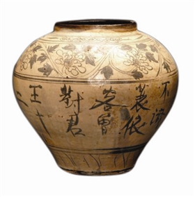 磁州窯還大量題寫(xiě)詩(shī)文做器物的裝飾,這種裝飾風(fēng)格最初始于唐代長(zhǎng)沙窯,而磁州窯得到進(jìn)一步的發(fā)展和完善,其書(shū)寫(xiě)方法無(wú)一定規(guī)格,非常隨意。