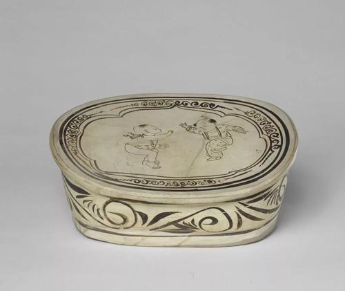 描述:枕呈腰圓形,枕面前低后高。白釉,枕面及枕側(cè)以黑彩繪嬰戲紋。枕面外周以雙線勾勒如意形開(kāi)光及雙弦紋,開(kāi)光與弦紋間飾四組卷枝紋。枕側(cè)繪簡(jiǎn)單的花草紋。枕面主題紋飾畫(huà)筆簡(jiǎn)練,描寫(xiě)兩個(gè)嬰孩玩耍,其中一孩兒頭上落一只小鳥(niǎo),孩兒驚愕不已,另一孩兒作興奮狀,欲上前捕捉小鳥(niǎo)。