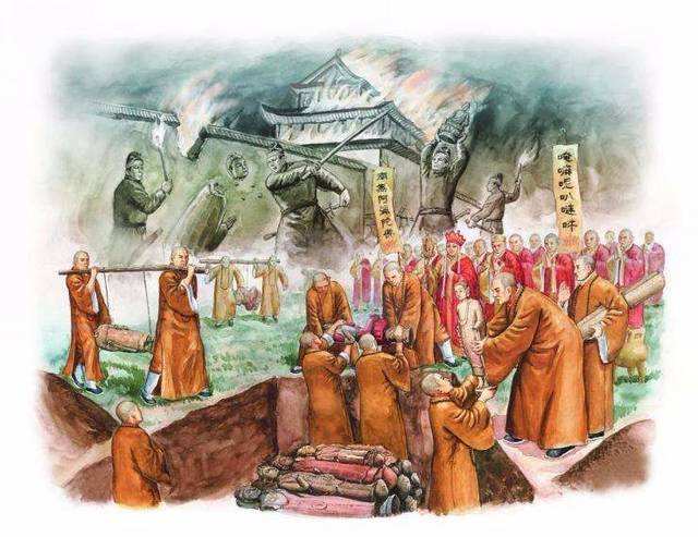 然而,僧尼還俗還不足以泄皇帝心中對佛教之惡,他們甚至向僧眾們舉起了屠刀。魏太武帝的措施是最為殘暴的,他采用“沙門無少長,悉坑之” 的方法來打擊佛教徒。幸運的是虔信佛教的太子拓跋晃時為留守平城的監(jiān)國,他利用秉政之機,有意緩宣太武帝的滅佛詔書,使遠近各地的僧侶得到消息后亡匿免死。但這只能是平城地區(qū)僧侶的幸運,其他地區(qū)的僧侶卻在劫難逃。《南齊書》卷五十七《魏虜傳》記載:“初,佛貍討羯胡于長安,殺道人且盡。”《高僧傳》卷十《曇始傳》也載:“以偽太平七年,遂毀滅佛法,分遣軍兵,燒掠寺舍,統(tǒng)內(nèi)僧尼悉令罷道,其有竄逸者,皆遣人追捕,得必梟斬。一境之內(nèi),無復沙門。”北魏太武帝甚至連為僧尼提供避難之所的俗人也不放過。據(jù)《魏書·世祖紀》稱:“自王公以下至于庶人,有私養(yǎng)沙門……在其家者,皆遣詣官曹,不得容匿。限今年二月十五日,過期不出,師巫、沙門身死,主人門誅。”唐武宗也下令,如有僧尼不伏還俗者,科違敕罪,當時決殺。會昌三年(843年)四月中旬,武宗令殺天下摹尼師,將剃發(fā)及著袈裟作沙門形殺之。由此可見,措施是嚴厲的,手段是殘暴的。但太武帝卻以滅佛是“除偽定真,復羲農(nóng)之治”,乃“有非常之人,然后能行非常之事” 而津津樂道。