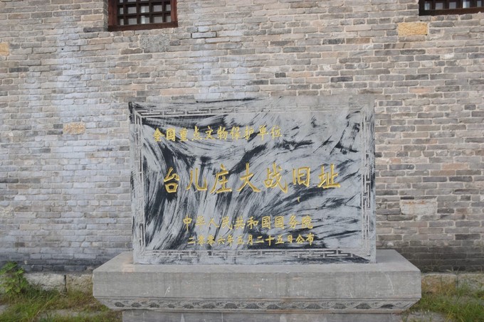 臺(tái)兒莊大戰(zhàn)遺址公園,位于臺(tái)兒莊古城較熱鬧地段,遺址公園內(nèi)保存有幾座臺(tái)兒莊大戰(zhàn)時(shí)的老宅,老宅墻壁上的累累彈孔默默訴說著當(dāng)年戰(zhàn)爭(zhēng)的殘酷性,也是講述臺(tái)兒莊大戰(zhàn)及緬懷中華民族一寸山河一寸血不屈的抗戰(zhàn)精神的圣地所在。臺(tái)兒莊大戰(zhàn)遺址公園也是各旅行團(tuán)游覽的第一站,因此,此地為臺(tái)兒莊古城景區(qū)內(nèi)人氣最旺的景點(diǎn)所在,我想這也是為了緬懷革命志士,宣傳臺(tái)兒莊不屈不撓的抗戰(zhàn)精神。