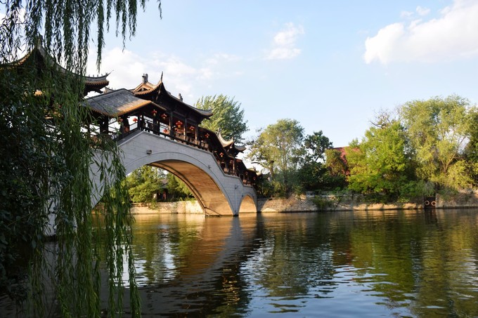 安瀾門,為一座城門式水閘,遠(yuǎn)看與古運(yùn)河似乎融為一體,如城門懸于河面。步云橋,為通往古運(yùn)河中安瀾島上的一座仿古廊橋,如飛虹橫跨于古運(yùn)河面。