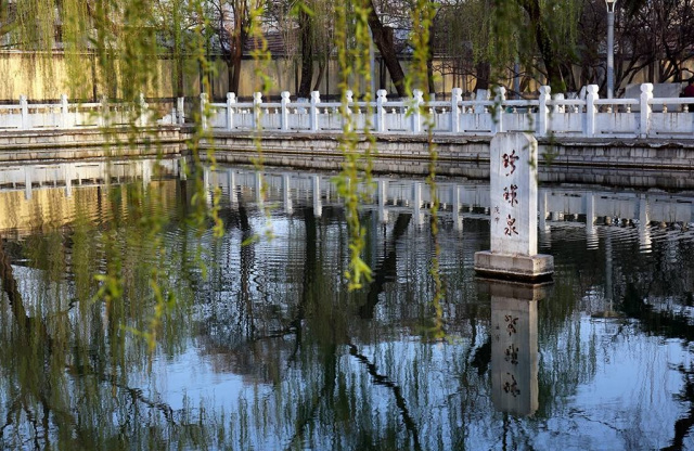 珍珠泉,坐落在院前街山東省人大常委會(huì)大院內(nèi)西側(cè),略成長(zhǎng)方形,面積1240余平方米,深廣清澈。因舊城東南隅護(hù)城河中有南珍珠泉,所以該泉又稱(chēng)北珍珠泉。金《名泉碑》、明《七十二泉詩(shī)》、清《七十二泉記》均著錄。泉池溢水標(biāo)高26.28米。珍珠泉泉水由玉帶河北流進(jìn)濯纓湖,經(jīng)百花洲注入大明湖。珍珠泉自古以來(lái)頗負(fù)盛名,歷代多有文人題詠。