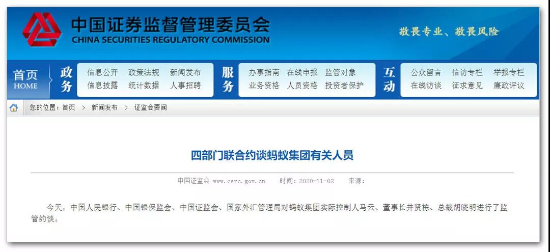 11月2日,中國人民銀行、中國銀保監(jiān)會、中國證監(jiān)會、國家外匯管理局齊聚一堂,約談螞蟻金服實際控制人馬云、董事長井賢棟。