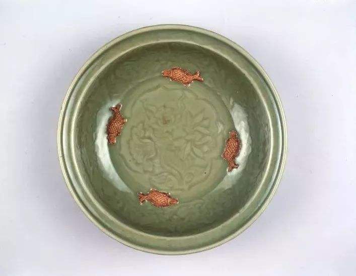 此洗敞口,折沿,圈足。洗心內(nèi)塑貼兩條游魚,外壁刻凸菊瓣紋一周。口沿兩側(cè)各有兩個穿孔,相互對應(yīng),可用于穿飾金屬提環(huán),以便于提攜。此器釉色青翠,塑貼魚紋清晰,是南宋龍泉窯的典型作品。在韓國新安海底沉船中亦發(fā)現(xiàn)有類似器物。