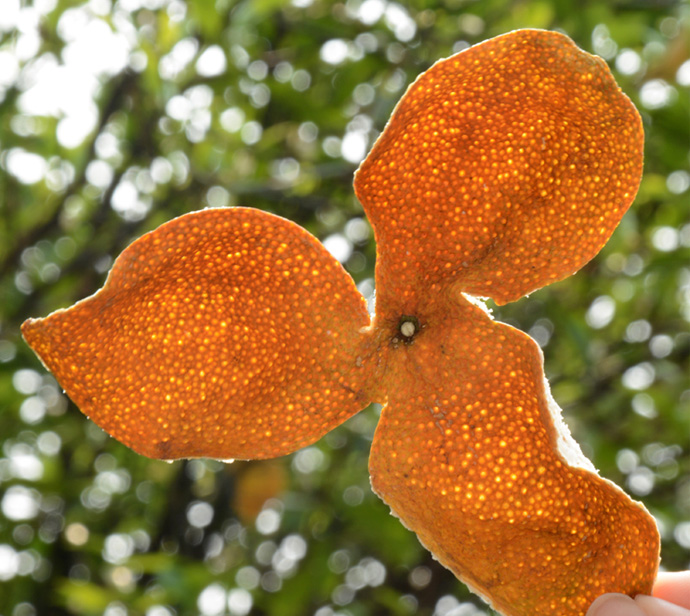 2、廣陳皮:常3瓣相連,形狀整齊,厚度均勻,約1mm,點(diǎn)狀油室較大,對(duì)光照視,透明清晰。質(zhì)較柔軟。