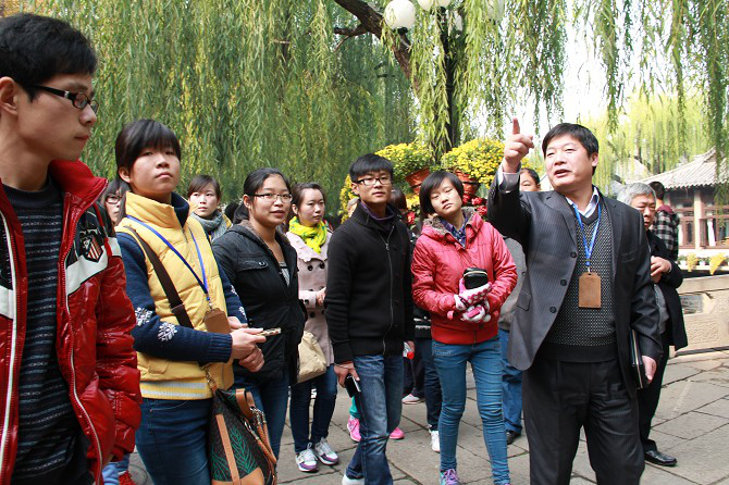 9日,全體學生在劉寶平老師的帶領下,從聊城職業(yè)技術學院出發(fā),經(jīng)一個半小時的車程,抵達此次考察的第一個目的地—濟南。一路上在劉老師針對全陪導游員注意事項和講解技巧做了詳盡介紹,在愉悅的氛圍中同學們充分領略到全陪導游的風采。同學們對此次考察充滿了期待,在這短短的九十分鐘車程中,車上充滿了歡聲笑語。8點50分在全國優(yōu)秀導游員張曉國老師的帶領下,同學們開始了此次活動第一個景點的考察。張導引經(jīng)據(jù)典、左證旁引,在他豐富的知識和嫻熟的講解下,大家對趵突泉、李清照紀念館、大明湖等景點有了更加深刻的了解。同學們在輕松愉快中度過了對“一水”的考察。