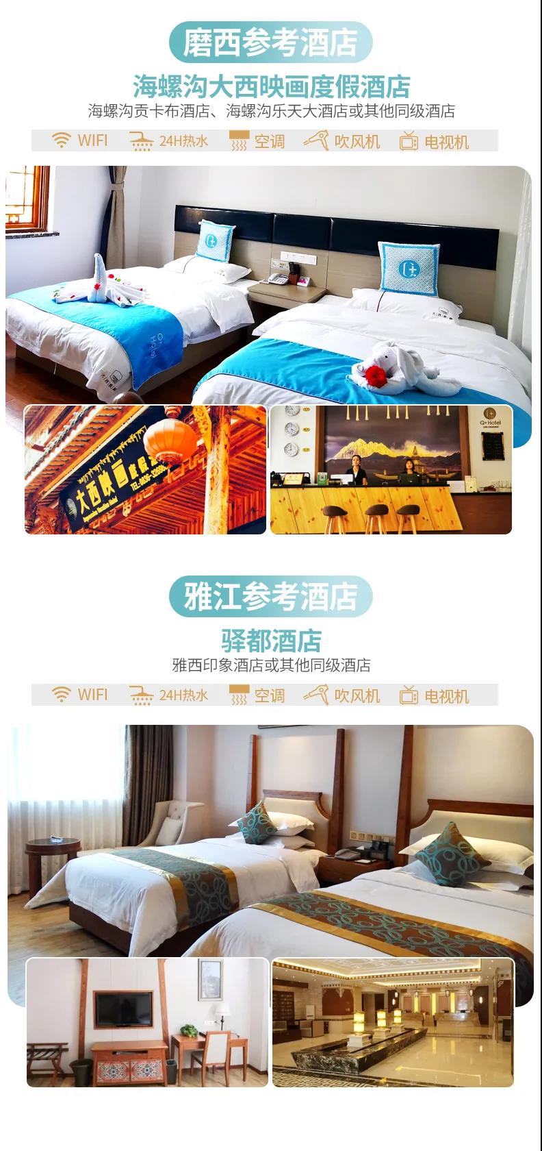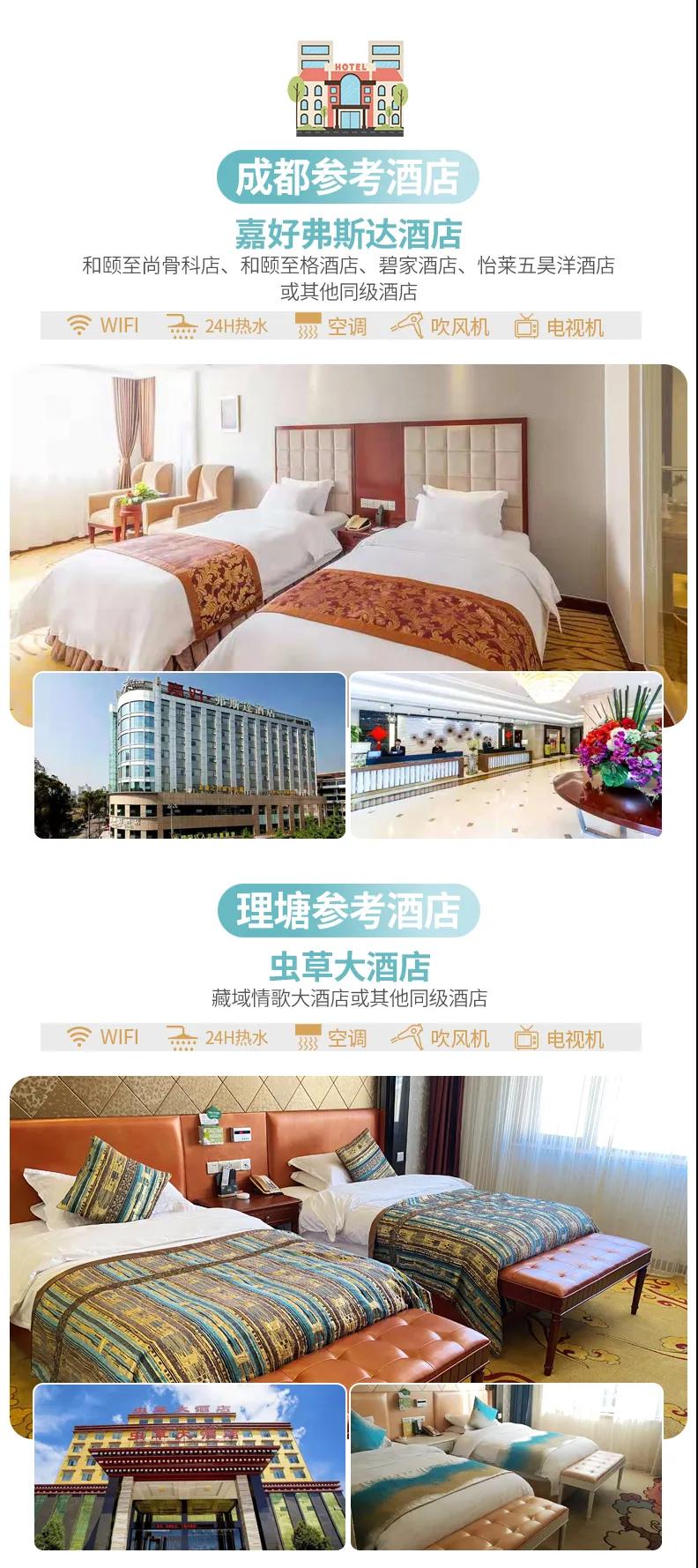 含全程6天5晚舒適酒店。我們反復(fù)踩點(diǎn)策劃了既能全景玩理塘又只需要入住一晚理塘,其他均是低海拔住宿,而且理塘我們特別安排了有氧地暖房,保證大家高原旅行的安全和行程體驗(yàn)。參考酒店如下(僅供參考,實(shí)際以訂房為準(zhǔn)):