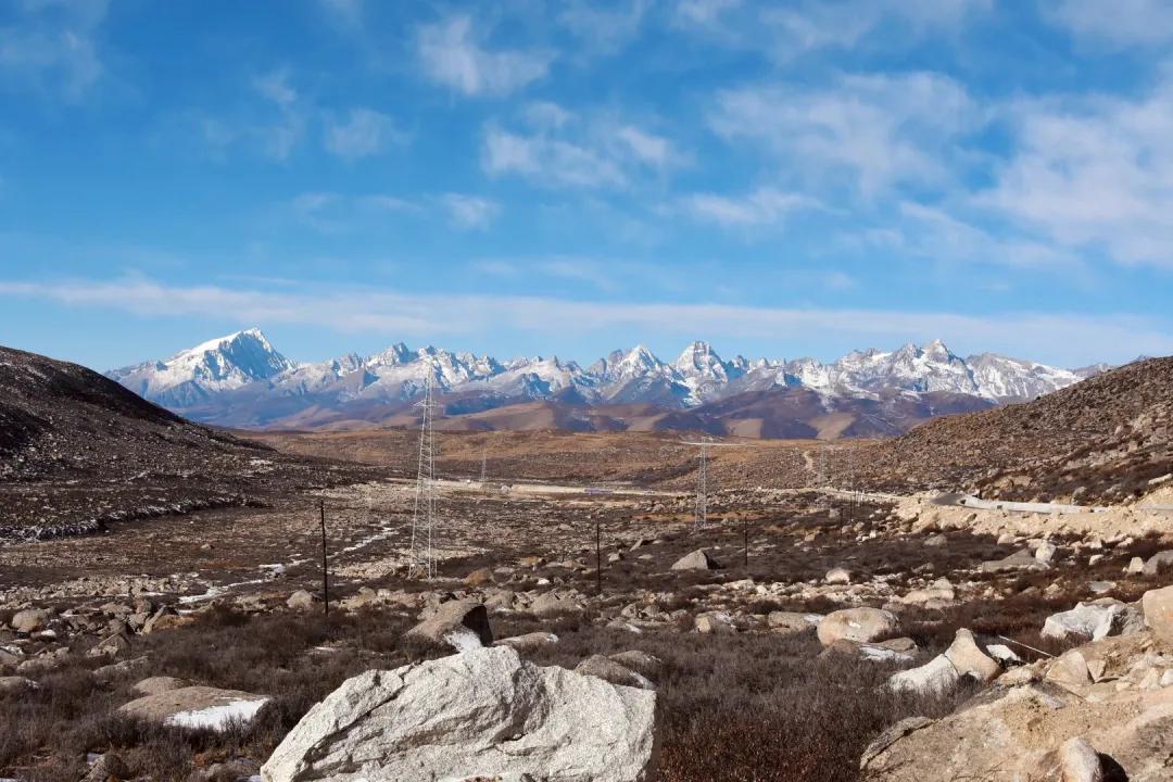 在從鐵匠山剛進(jìn)入格聶山區(qū)時(shí),格聶群峰橫陳天際,這是遠(yuǎn)眺格聶群峰的最佳位置。在這里可以看到三座巨大的雪山從地平線上騰空而起,格聶、肖扎、喀麥隆、庫日崗中等數(shù)座神山從左向右一字排開,像一堵雪山屏障一樣,蔚為壯觀。