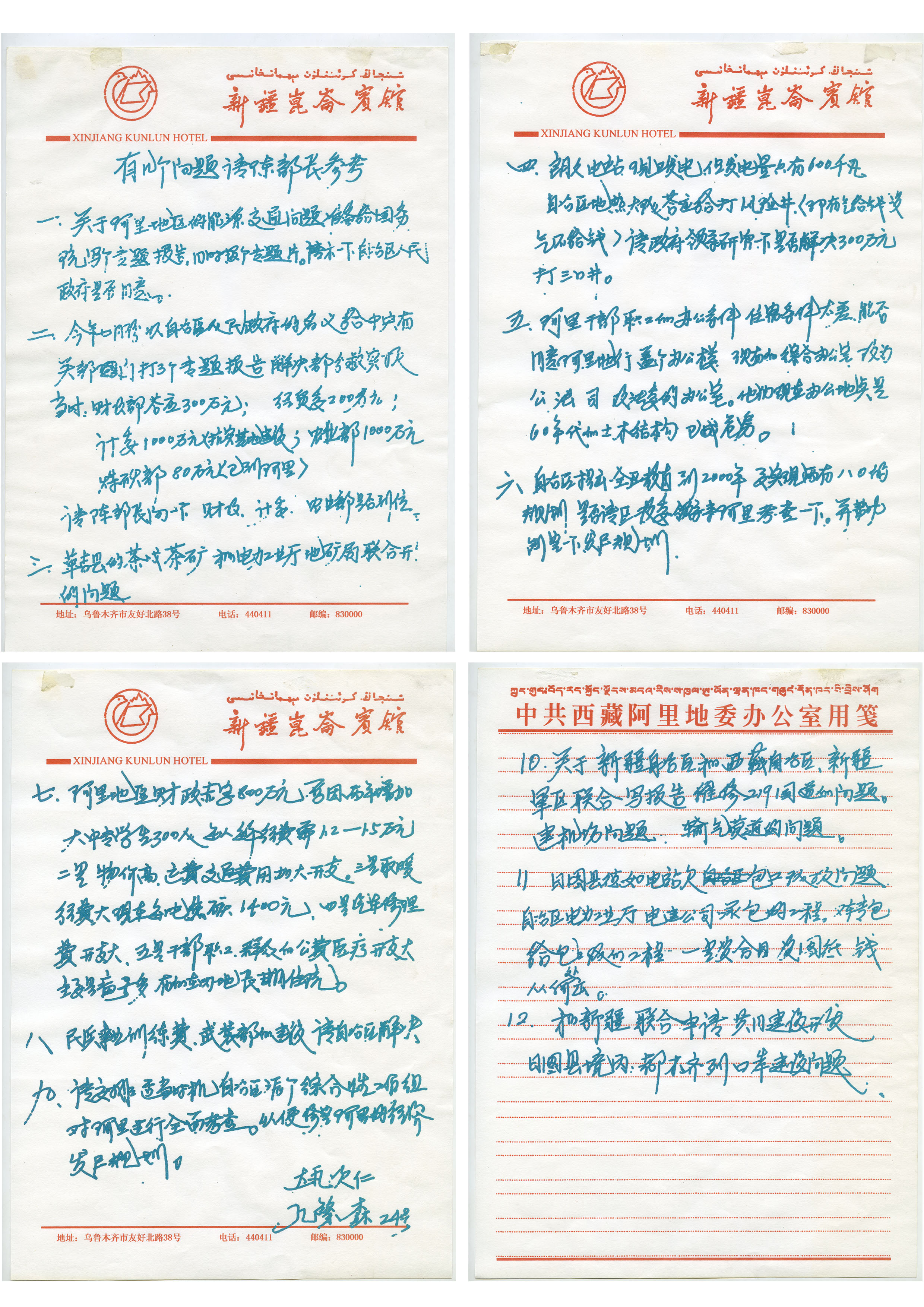 在孔繁森同志紀(jì)念館展廳的一個(gè)展柜中,陳列著這樣的四頁便箋:在三張新疆昆侖賓館的稿紙和一張阿里地委辦公室用箋上,孔繁森用藍(lán)色鋼筆寫下的請(qǐng)陳部長參考的十二條問題。這些問題寫于1994年11月24日深夜,傾注著孔繁森對(duì)阿里發(fā)展的急切心情,滲透著他對(duì)阿里建設(shè)的心血,體現(xiàn)了他作為一個(gè)地委書記的使命感和責(zé)任感。