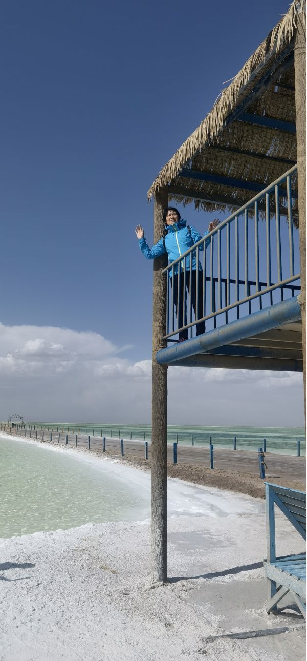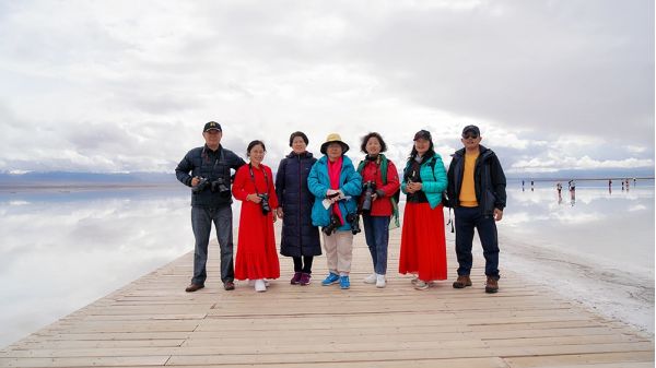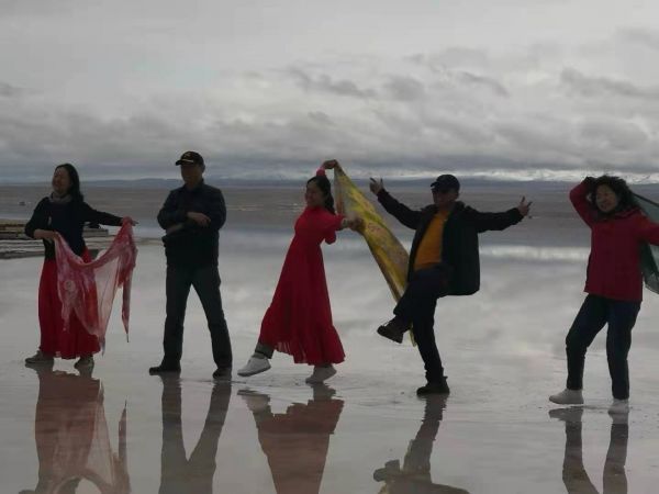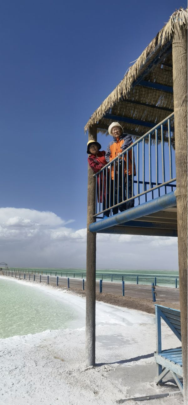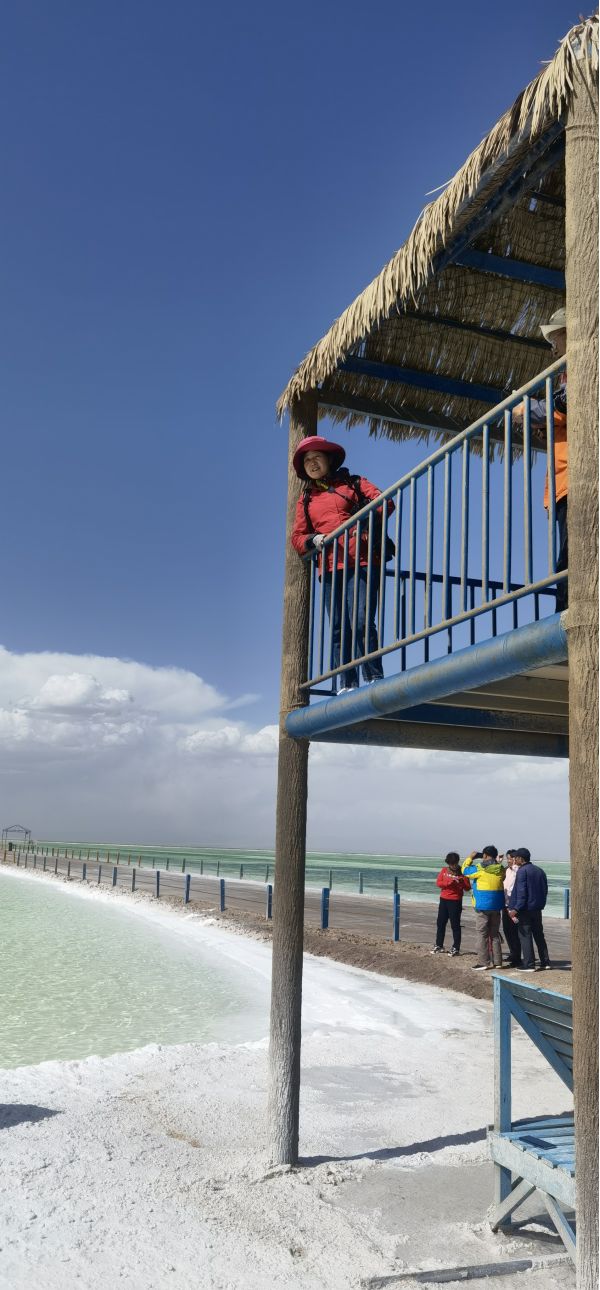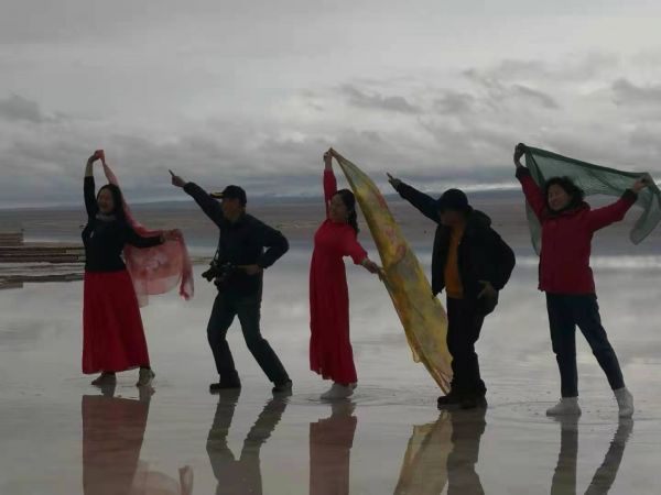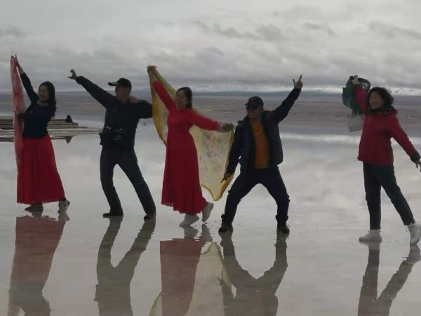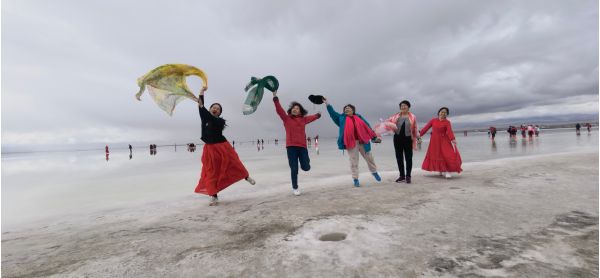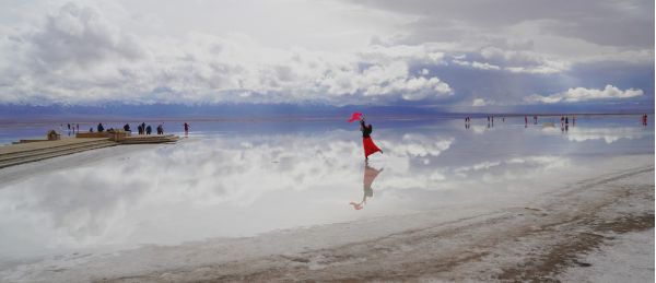 時(shí)速大約相當(dāng)于人的走路的兩倍到三倍,咣當(dāng)咣當(dāng)?shù)故遣坏⒄`欣賞一路風(fēng)景。目的地就是當(dāng)年鹽場采鹽的鐵路的盡頭。鹽水很淺,風(fēng)平浪靜,翠綠的鹵水倒影著遠(yuǎn)處的雪山,風(fēng)景剎是美麗,水也就是能沒到腳面,租他的膠鞋和紅色的裙子可以到鹽湖里面拍攝。紅色的裙子倒影非常漂亮,遠(yuǎn)處的云彩黑白相間。一朵一朵相擁而來,紅色的裙子,翠綠色的湖水,藍(lán)色的天空白色的雪山,真是如入仙境,大家操作無人機(jī)上下左右拍了無死角,兩個(gè)多小時(shí)瞬間過去,說好的是5點(diǎn)返程,6點(diǎn)了大家還意猶未盡,流連忘返。