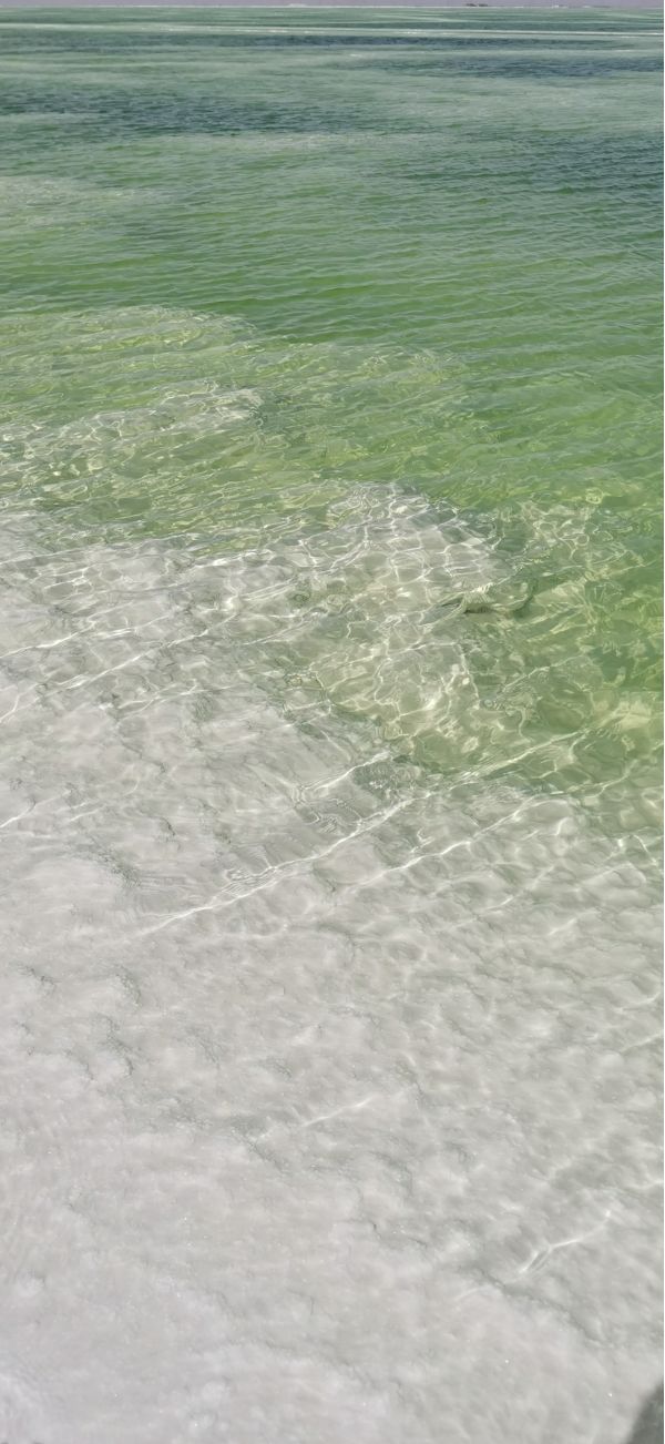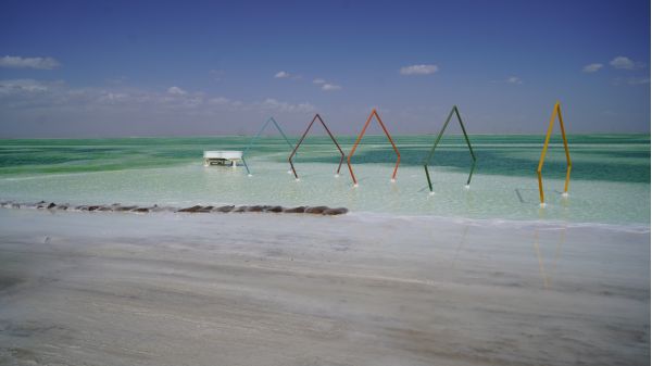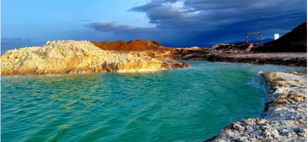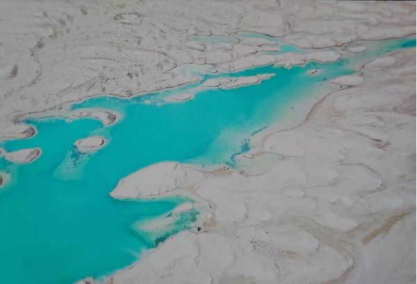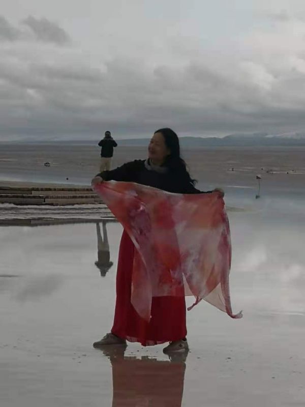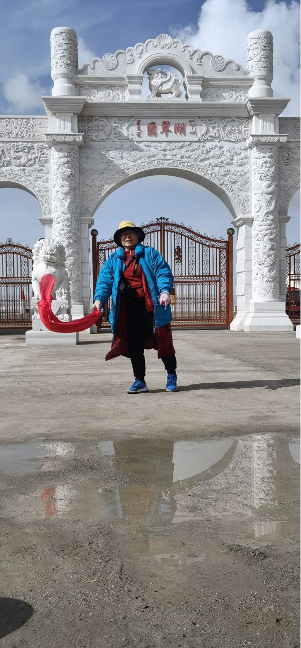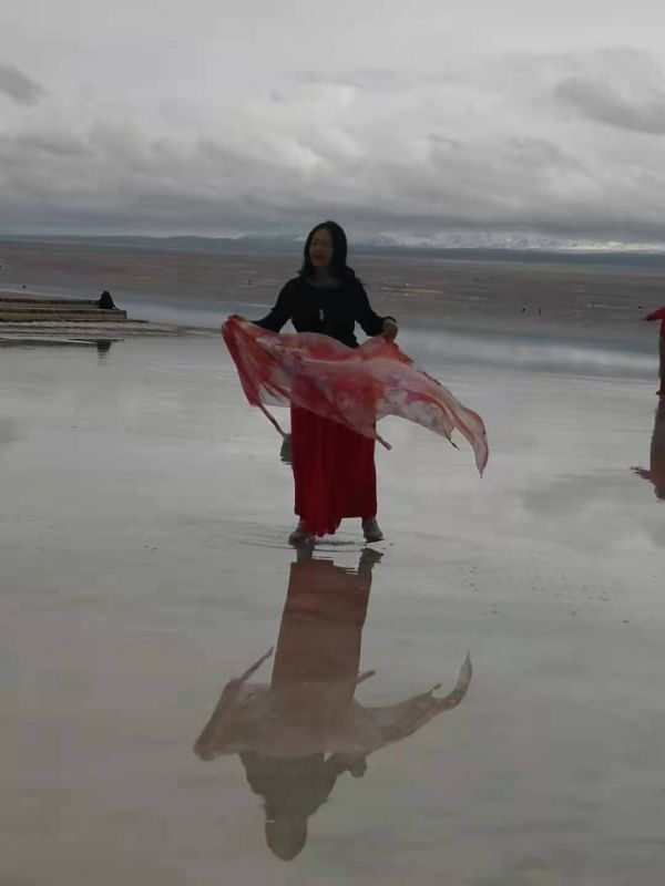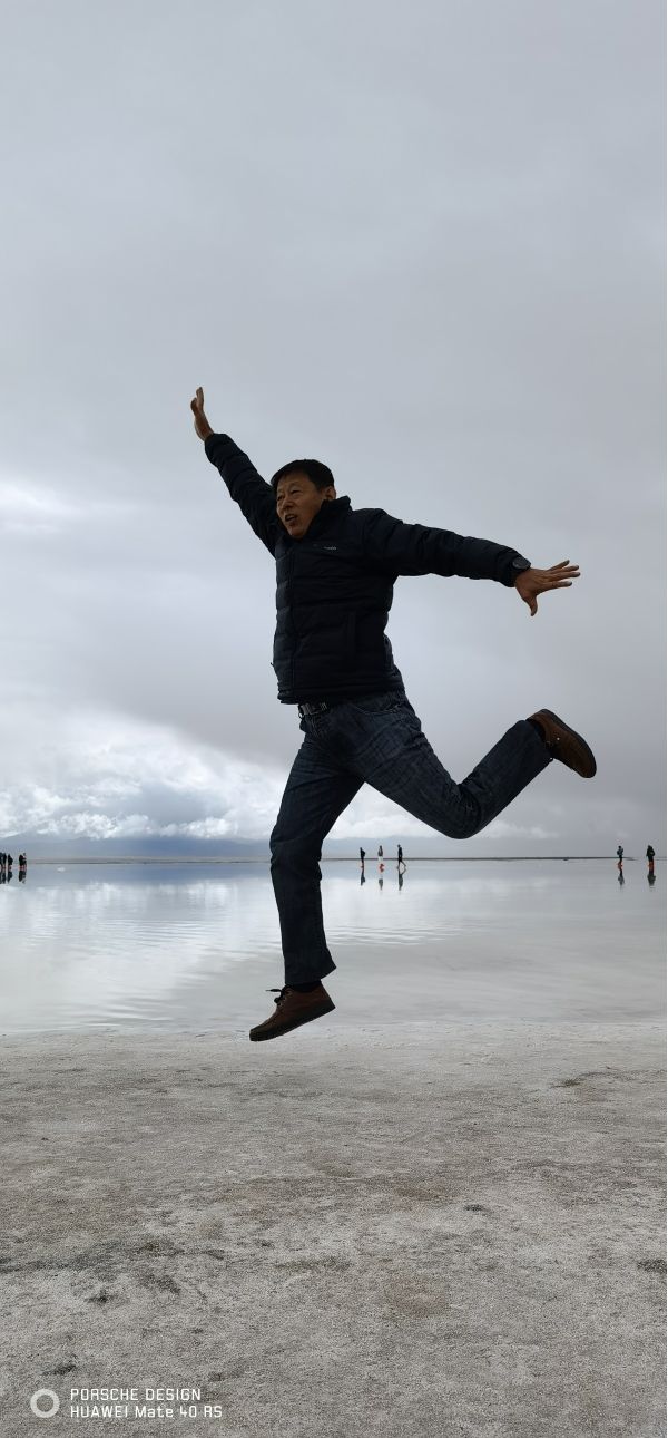 時(shí)速大約相當(dāng)于人的走路的兩倍到三倍,咣當(dāng)咣當(dāng)?shù)故遣坏⒄`欣賞一路風(fēng)景。目的地就是當(dāng)年鹽場采鹽的鐵路的盡頭。鹽水很淺,風(fēng)平浪靜,翠綠的鹵水倒影著遠(yuǎn)處的雪山,風(fēng)景剎是美麗,水也就是能沒到腳面,租他的膠鞋和紅色的裙子可以到鹽湖里面拍攝。紅色的裙子倒影非常漂亮,遠(yuǎn)處的云彩黑白相間。一朵一朵相擁而來,紅色的裙子,翠綠色的湖水,藍(lán)色的天空白色的雪山,真是如入仙境,大家操作無人機(jī)上下左右拍了無死角,兩個(gè)多小時(shí)瞬間過去,說好的是5點(diǎn)返程,6點(diǎn)了大家還意猶未盡,流連忘返。