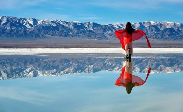 秋冬時的鹽湖凍結成冰,白色的湖面和藍色的天空時畫面的主要色彩;春夏之季,湖水恢復本來的淡藍色面貌。穿衣搭配建議: