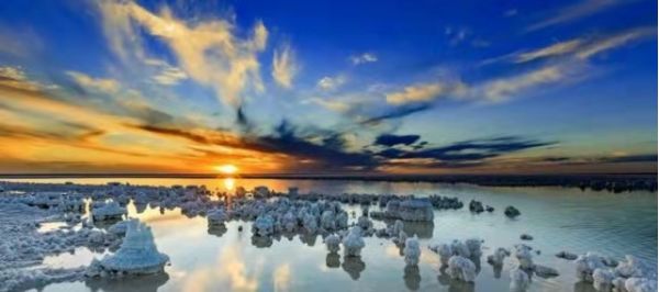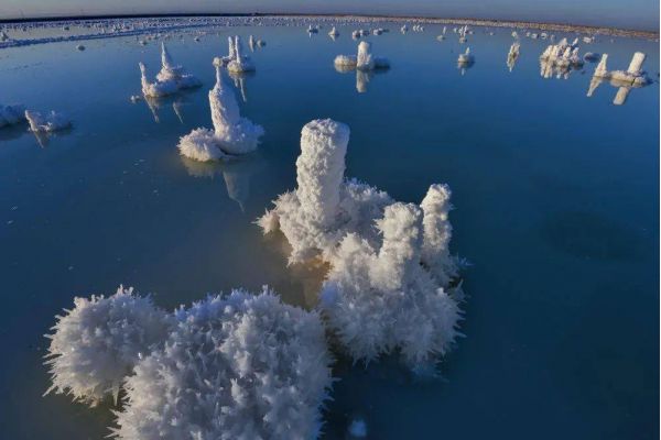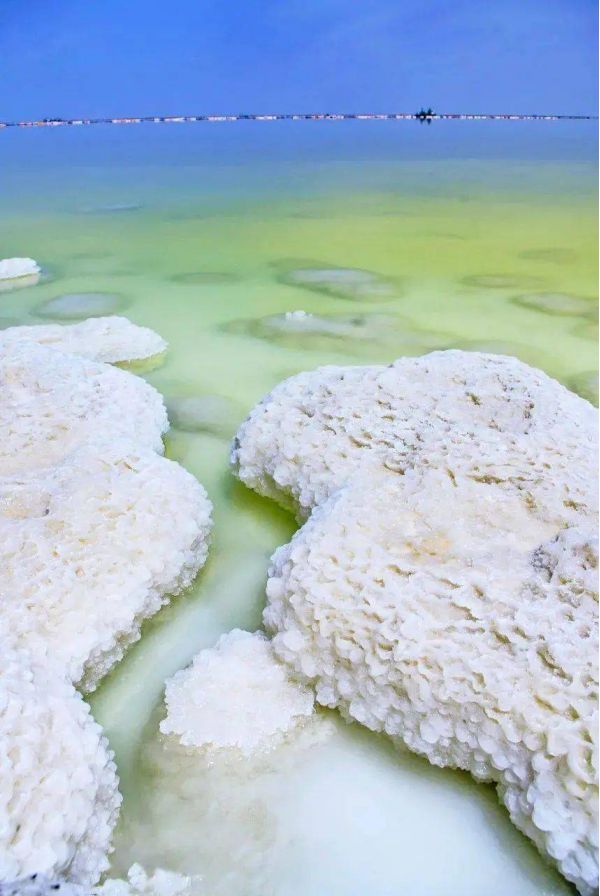 因?yàn)闅夂蜓谉岣稍铮恼舭l(fā)量遠(yuǎn)遠(yuǎn)高于降水量,湖內(nèi)便形成了高濃度的鹵水,然后逐漸結(jié)晶成了鹽粒。而鹽花是鹽湖中的鹽結(jié)晶形成的特殊形狀的結(jié)晶體,由于結(jié)晶時(shí)的溫度,氣候,時(shí)間長(zhǎng)短,濃度不同等原因,形成了各式各樣,萬(wàn)千變化的美麗鹽花。生命的禁區(qū),萬(wàn)物俱寂,但是唯有“鹽花”開的最旺,它就是大自然賜給人類的絕妙作品,日夜看守這片凈土。這些鹽花無(wú)需人工的雕琢,形態(tài)各異,有的宛如貝殼,有的宛如樓臺(tái),一叢叢,一片片,一簇簇地立于鹽湖中,把鹽湖裝飾得如仙境一般。
