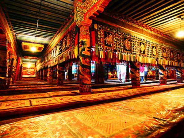 大經(jīng)堂始建于明萬歷三十四年(1606),毀于火,1917年重建。土木結(jié)構(gòu),為藏式雙層平頂建筑,漢式樓閣遙相互映。經(jīng)堂面闊十三間,進(jìn)深十一間。面積1981平方米。堂內(nèi)四壁存放著數(shù)百冊(cè)經(jīng)卷。