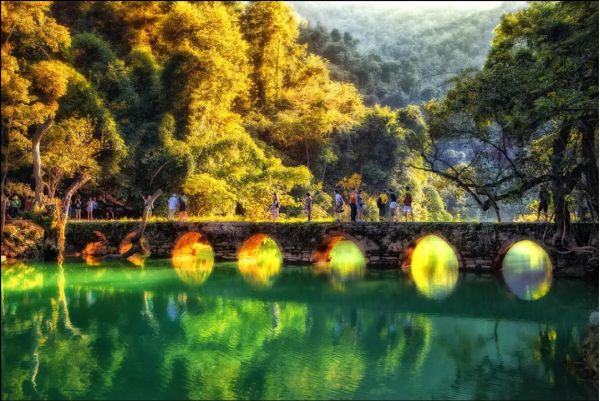 早餐后前往國家AAAAA級風景區(qū)【小七孔】(游玩時間約4小時);景點之間需換乘電瓶車(電瓶車40元/人,景區(qū)保險10元/人,費用自理)小七孔景區(qū)因一座建造于道光十五年間(1836年)的【小七孔石橋】而得名;景區(qū)被稱之為“超級盆景”,集山、水、洞、林、湖、瀑布等為一體,在長不到2公里的峽谷內(nèi),起迭著68級瀑布,順贄而下,奔瀉而去【68級跌水瀑布】。【拉雅瀑布】精巧醉人,水珠飛濺;而長不到600米之水上森林,樹根盤在錯石上,清澈的水流沖刷著青石,行走于其中,若身臨瓊瑤仙池。拱壩截水而形成的【臥龍?zhí)?/strong>】水從壩頂傾瀉下來,如一道銀色的水簾掛在眼前,壯觀而又秀美,水面經(jīng)過吸收、反射和折射,呈現(xiàn)各種藍色,真是美如仙境。