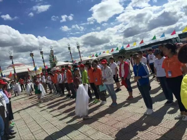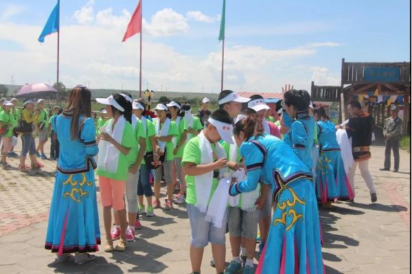 下午:來到了美麗的安固里草原,蒙古族小伙和姑娘們載歌載舞,為營員獻(xiàn)上潔白哈達(dá),遞上蒙古歡迎禮節(jié) “下馬酒”。