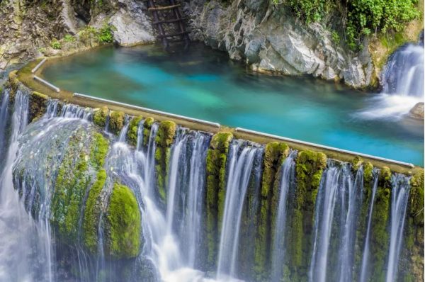 螺髻山九十九里溫泉不僅是世界第一大溫泉瀑布,還是世界唯一的掛壁溫泉、世界唯一的溫泉群島,由數(shù)十個(gè)大小不一的溫泉瀑布組合而成的一個(gè)寬達(dá)200余米的溫泉瀑布群。首先映入眼簾的是一泓清澈見(jiàn)底的大槽河,河流纏繞在青山綠水間,漫步在奔騰而下的大槽河畔,陣陣涼風(fēng)夾雜著水霧撲面而來(lái),郁郁蔥蔥的山嶺上百瀑飛瀉,雄奇的靈崖異石,成群的瀑布形態(tài)各異;順著河流而上,聲響如雷,一簾高31米寬19米掛在懸崖峭壁之上的溫泉瀑布呈現(xiàn)在了眼前,銀簾空懸而掛,蒸騰彌漫、熱霧繚繞;崖壁上的天然小水池,被稱之為“鴛鴦池”,沐浴其間,聽(tīng)滴水彈琴,享靈崖泉韻,觀簾外景物,撲塑迷離,恍若大虛幻景。