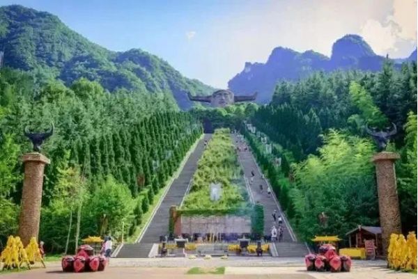 神農(nóng)壇分天、地二壇,依山而建。天壇正中聳立著炎帝神農(nóng)巨型牛首人身雕像。天壇之下為地壇,辟有可容數(shù)千人之眾的廣場。廣場大圓圖案,代表天;圓心處設(shè)正方形,代表地,方形圖案中,五彩石分列表示木、火、土、金、水五行。