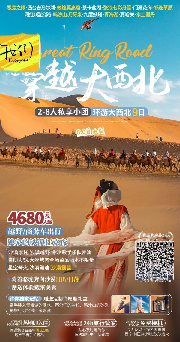如果讓我們推薦一條去- -次抵十次的旅行路線,那一定是西北大環(huán)線!沙漠、戈壁、雪山、草原、花海、湖泊、石窟、雅丹、丹霞...這些看似無(wú)法兼容的美景,全部都真實(shí)匯聚在這條線路.上!,我們深耕大西北多年,不斷打磨迭代升級(jí)推出西北大環(huán)線6.0版本,保留最經(jīng)典的風(fēng)景,解鎖小眾高顏值景點(diǎn)給你最難忘的大西北旅行。
