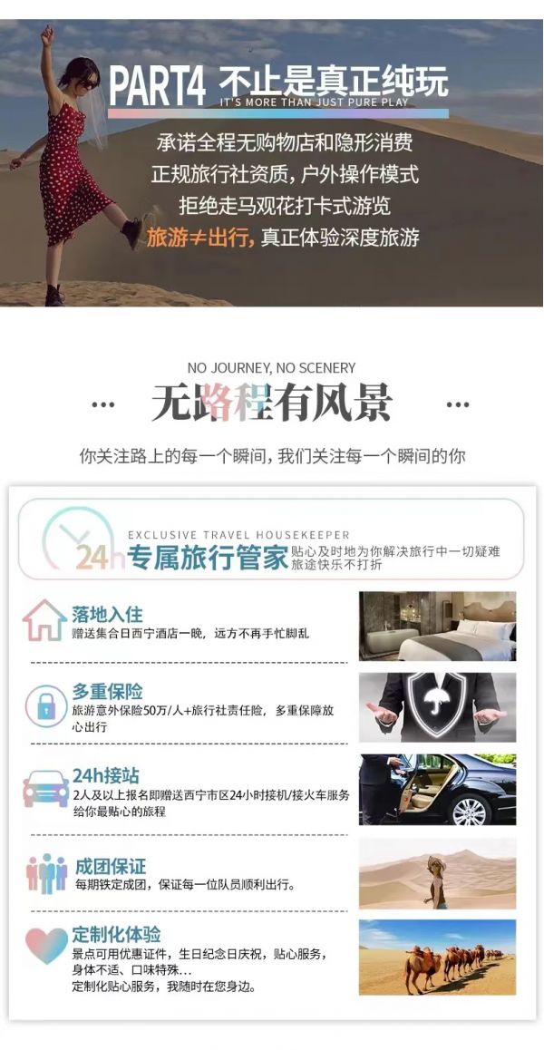 請(qǐng)對(duì)應(yīng)使用我方穿越大西北2-8人VIP私享小團(tuán)9日行程,因使用其它行程造成的投訴,責(zé)任自負(fù);請(qǐng)仔細(xì)閱讀以上行程文檔,同意并保證遵守我方安排,以免為您帶來(lái)不必要的麻煩;如產(chǎn)生合同糾紛或人身意外事故,按《中華人民共和國(guó)合同法》、《道路交通法》、《保險(xiǎn)賠償條例》裁定;本行程作為旅游合同附頁(yè)與旅游合同同等法律效力。