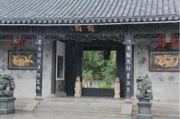 這也應(yīng)了廊柱上那副道盡宛園山水的對(duì)聯(lián):“河水經(jīng)天積金銀氣,靈山鎮(zhèn)地多珠玉林。”