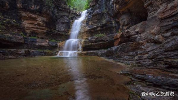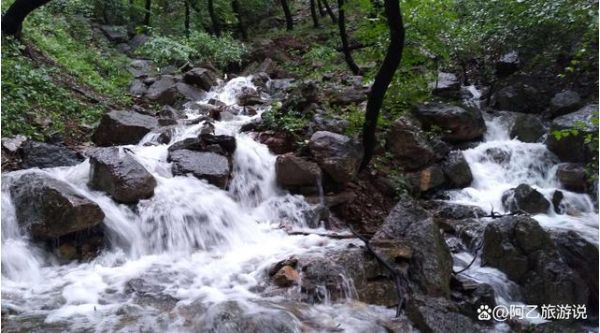佛峪深處藏有一處瀑布,夏季水流充沛,落差目測有6-7米。瀑布上下有三層小階梯,水流不算湍急。瀑布四季有水,但在冬天會出現(xiàn)冰掛,又是另一番景色。