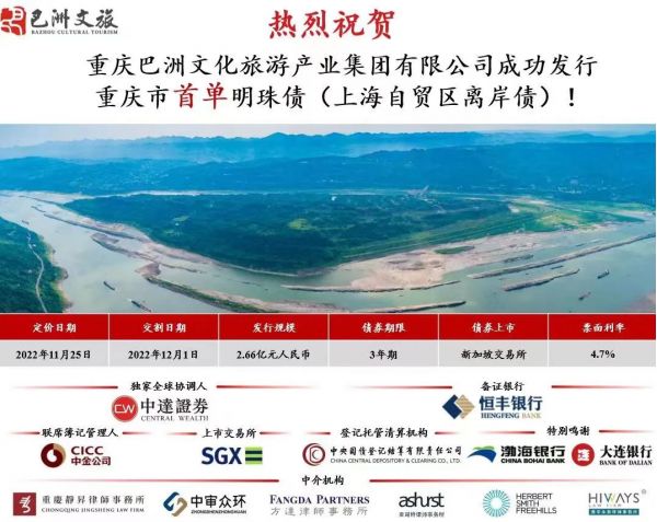 近日,由靜昇律師事務(wù)所提供法律服務(wù)的重慶巴洲文化旅游產(chǎn)業(yè)集團(tuán)有限公司2022年度上海自貿(mào)區(qū)離岸債券成功發(fā)行。本次上海自貿(mào)區(qū)離岸債券發(fā)行規(guī)模為人民幣2.66億元,發(fā)行期限為3年,票面利率4.7%,由恒豐銀行擔(dān)任備證行,由中達(dá)證券主承銷。本次發(fā)行的上海自貿(mào)區(qū)離岸債券是該種類債券在重慶市的首次發(fā)行,具有里程碑式意義。