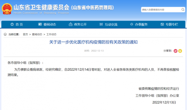 山東省衛(wèi)健委官網(wǎng)13日晚發(fā)布《關(guān)于進(jìn)一步優(yōu)化醫(yī)療機(jī)構(gòu)疫情防控有關(guān)政策的通知》:
