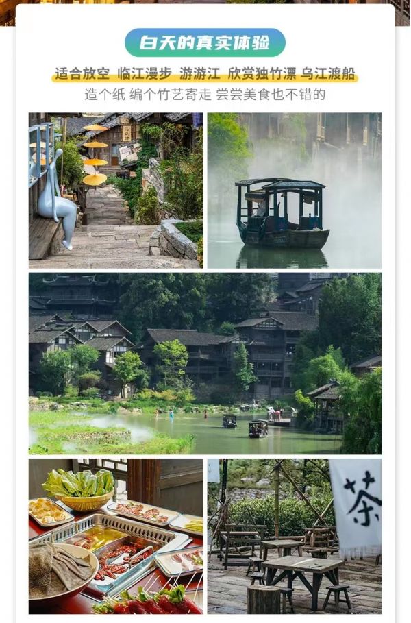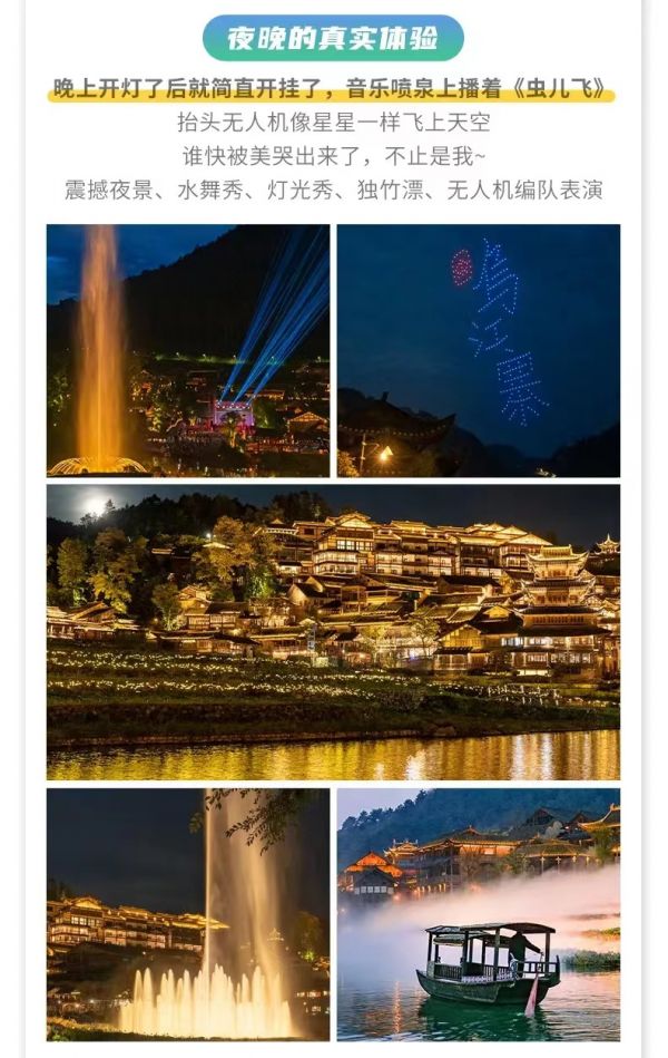 4.保證入住網(wǎng)紅國際度假區(qū)——烏江寨,震撼夜景、水舞秀、燈光秀、獨(dú)竹漂和無人機(jī)編隊(duì)等表演。