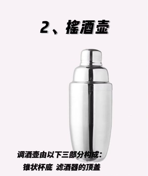2.搖酒壺 調(diào)酒壺可以有效地把雞尾酒中的各種材料混合到-起。調(diào)酒壺由以下三部分構(gòu)成:錐狀杯底,濾酒器的 頂蓋,與頂蓋相配的小蓋子。