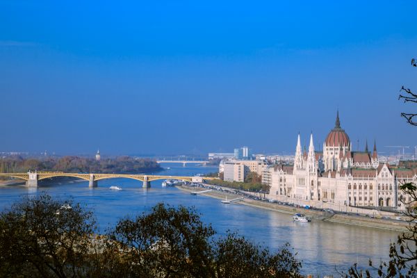 布達(dá)佩斯宛若一位天生麗質(zhì)的仙女,高貴優(yōu)雅,依偎在多瑙河畔。鏈子橋、伊麗莎白橋、裴多菲橋……是她頸上的一串串項(xiàng)鏈;1904年落成的國會大廈是她胸前的一顆徽章;兩岸掩映在綠樹叢中古趣盎然的街道和幢幢別墅是她長裙上的飄帶。她那脫離塵埃的一種清澈氣質(zhì),可謂是超出了畫圖而化生了音樂的神韻。