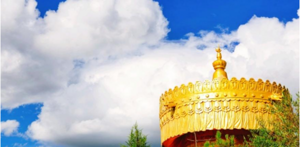 大佛寺轉(zhuǎn)經(jīng)筒是世界上最大最高的轉(zhuǎn)經(jīng)筒,筒身為純銅鍍金,在筒壁上端用浮雕篆刻著文殊,普賢,觀音,地藏四大菩薩,下端刻著佛家的八寶圖。