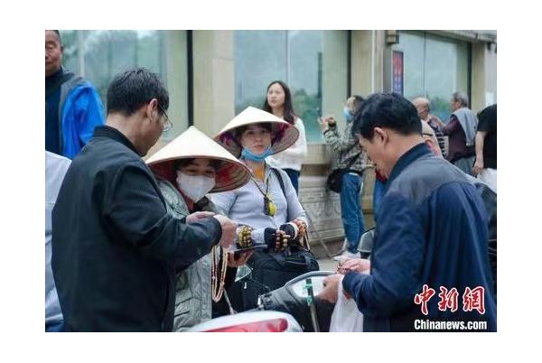 “我剛從越南過來,請幫忙開個張。”范氏香用一口流利的中文力爭早市“開門紅”,并向記者展示她的邊境通行證,她的單肩挎包里裝有紅木、黑檀、沉香等不同材質(zhì)的手串,手上也戴著數(shù)串向游客展示。范氏香說,她恢復(fù)這項(xiàng)營生已經(jīng)十來天,前一天賺了100多元(人民幣,下同)利潤。