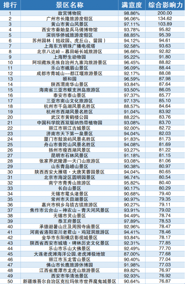 318家5A級(jí)景區(qū)中游客們滿意度最高的TOP50是哪些?基于對(duì)我國(guó)5A景區(qū)的全網(wǎng)口碑輿情分析,各個(gè)景區(qū)創(chuàng)建以來(lái)截至目前,旅游口碑表現(xiàn)最好的前50家景區(qū)如下表所示:其中,故宮博物院、廣州長(zhǎng)隆旅游度假區(qū)、黃山風(fēng)景區(qū)、秦始皇兵馬俑博物館、深圳華僑城旅游度假區(qū)位列前五。