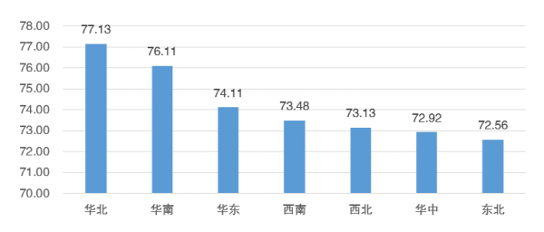 游客對(duì)景區(qū)類(lèi)型有偏好之外,景區(qū)所屬不同地域也表現(xiàn)出了差異。從統(tǒng)計(jì)數(shù)據(jù)來(lái)看,各地區(qū)整體水平都較高,且差距不大,提升潛力較大。其中華北地區(qū)表現(xiàn)最高,為77.13;其次為華南地區(qū),為76.11;而華東地區(qū)則位居第三,為74.11。東北與華中地區(qū)表現(xiàn)較為滯后。