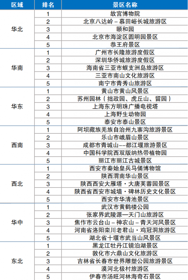 分地區(qū)來(lái)看,東北地區(qū)綜合影響力排行榜首為牡丹江鏡泊湖景區(qū);華北地區(qū)的榜首為故宮博物院;華東地區(qū)以黃山風(fēng)景區(qū)為第一位;華南地區(qū)的榜首為長(zhǎng)隆旅游度假區(qū);華中地區(qū)的榜首為黃鶴樓公園;西北地區(qū)的秦始皇兵馬俑博物館最有影響力;西南地區(qū)的九寨溝旅游景區(qū)位居榜首。