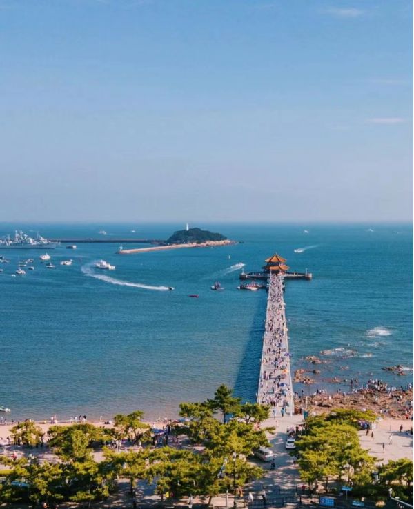 青島棧橋始建于清光緒十八年(1892年),是青島的重要標(biāo)志性建筑物和著名風(fēng)景游覽點(diǎn) ,據(jù)說棧橋是青島第一個(gè)碼頭 最初所為海軍碼頭,德國侵占青島后改為貨運(yùn)碼頭。青島棧橋全長440米,寬8米,鋼混結(jié)構(gòu),橋南端筑半圓形防波堤,堤內(nèi)建有民族形式的兩層八角樓,名"回瀾閣","飛閣回瀾"被譽(yù)為"青島十景"之一。來青島,在棧橋上喂喂海鷗,在落潮的時(shí)候站在礁石上走近大海,這里比任何一個(gè)有海的城市都多了一份歷史的韻味,感受這里的空氣和大海的味道,自然的放慢腳步,在喧囂的市井生活里, 這里是難得的愜意時(shí)光。棧橋沿岸,就是棧橋公園,離車站不是很遠(yuǎn),來青島的第一站便是這里,從青島站步行到棧橋,也不需要太長的時(shí)間,漫步棧橋海濱,游人如織,微風(fēng)徐徐,海鷗自由自在的飛過,游艇載著游客暢游碧海之中……感受青島的歷史韻味和美麗的風(fēng)景,駐足停留于棧橋,碧海藍(lán)天,直到黃昏,夜幕降臨,每一個(gè)時(shí)刻都是美的享受。
