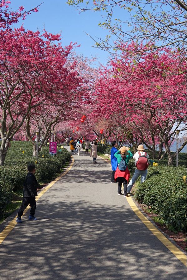這里的櫻花與別處的櫻花有著很大的區(qū)別。別處的櫻花雖然是一處處一叢叢,但一般都種植在土里,從下往上拍照就顯得不太美觀。臺(tái)品櫻花茶園的櫻花和高山茶山相映成趣,構(gòu)成了無論從哪個(gè)角度拍都能完美出片的特有氛圍,粉色櫻花鑲嵌在漫山翠綠的茶園中,十里茶道,一片花海。乘坐櫻花樹下的小火車,從櫻花茶叢中緩緩駛過,撲面而來的是茶香花香,偶爾能看到茶農(nóng)們?cè)诓栝g勤作,這美景都是出自這一雙雙勞動(dòng)的手,在這獨(dú)特的景觀帶上,心中滿是對(duì)春天的憧憬,坐著享受春天的愜意與美好。