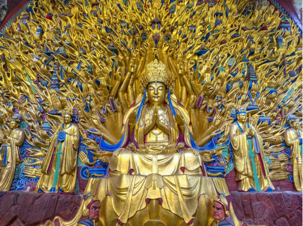 牧牛道場的石刻非常生活化,看似在講牧牛人和牛之間的互動(dòng)變化,實(shí)則是用生活化的方式傳達(dá)出佛教禪觀的修正過程;圓覺洞是修煉成佛的最后一步,體現(xiàn)的是佛祖問心的過程,這個(gè)洞深12米,有三絕:采光、排水以及鑿石,進(jìn)去的時(shí)候一片黑暗,后來慢慢變亮,就是這個(gè)洞采光的特點(diǎn),也給人一種心靈得到洗滌逐漸變得通透的感覺;最令人震撼的石刻就是千手觀音像了,經(jīng)過多年的修復(fù),千手觀音終于在世人面前呈現(xiàn)出她最完美和輝宏的姿態(tài),身披金縷,面容莊嚴(yán),據(jù)修復(fù)數(shù)據(jù)顯示此處千手觀音像共有1008只手,每只手的姿態(tài)和手中的法器無一重復(fù),是名副其實(shí)的千手觀音,在每只手的掌中都有一只眼睛,也是一處通風(fēng)口,既有藝術(shù)性又能保證石刻不被風(fēng)化,千年而不倒。