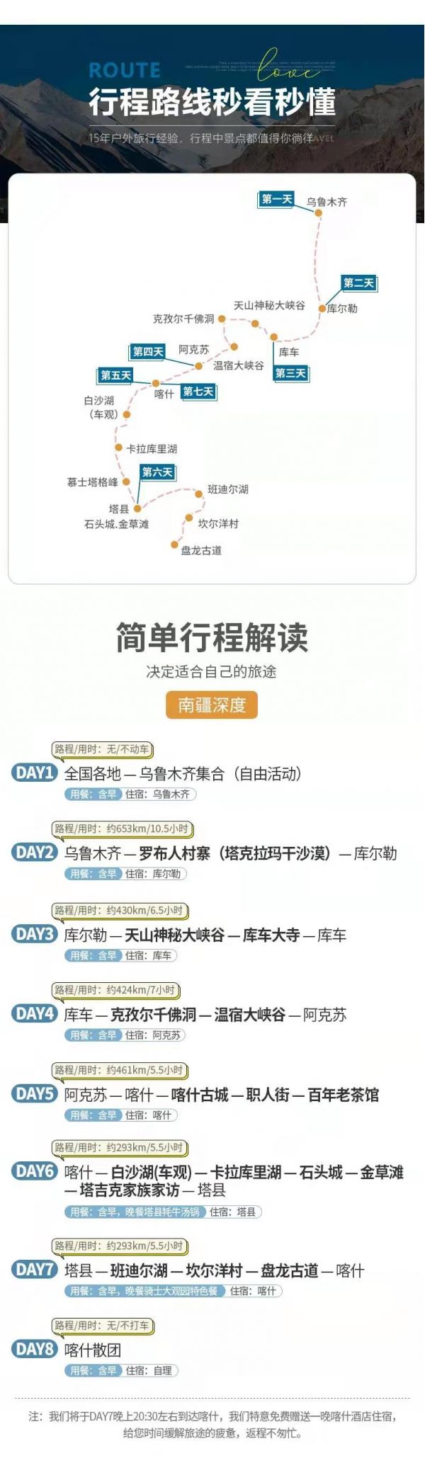 當(dāng)天車程較長,從北疆穿越天山甘溝進(jìn)入南疆腹地,氣候變化較大,請(qǐng)適當(dāng)增減衣物,注意補(bǔ)充水分。可提前購買一些零食,以備不時(shí)之需。