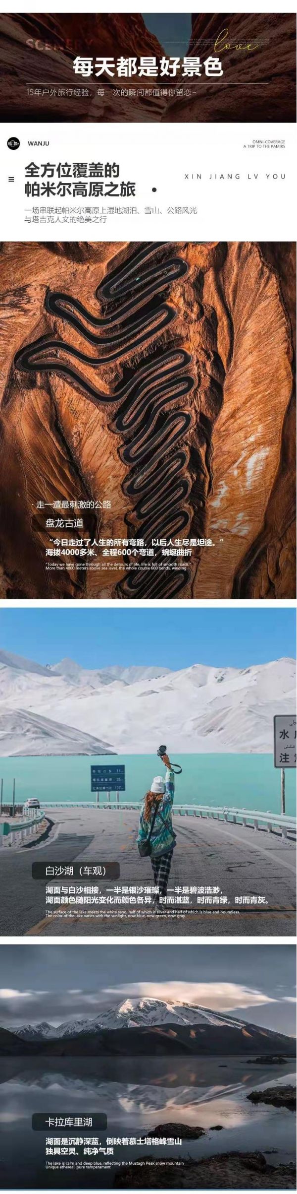 告別“東方摩洛哥”—喀什,我們將開啟一段帕米爾高原之旅。沿314國道一路暢游帕米爾高原風(fēng)光,首先驚艷我們的是背靠白色沙丘和雪山的【白沙湖】,在陽光的變化下,湖水時(shí)而呈湛藍(lán)色,時(shí)而呈綠色。更令人驚嘆的是,藍(lán)色的湖面與白沙相接,一半藍(lán)一半白,而白沙背后還有雪山。在雪山和白沙的映襯之下,白沙湖水更顯澄澈。在這里能get湖泊、白沙、雪山同框的畫面。分享一個(gè)冷知識(shí):白沙湖又名流沙河,就是西游記里唐僧收服沙和尚的地方。我們還能途觀慕士塔格峰,山頂常年皚皚白雪,猶如滿頭白發(fā),十余條冰川鑲嵌在峰體下的峽谷中,如胸前飄動(dòng)的銀須,故有“冰山之父”的美稱。隨后我們將遇見【卡拉庫里湖】,這里能看到雪山倒映在湖面的風(fēng)景,拍出來的照片特別的給人純凈的感覺。