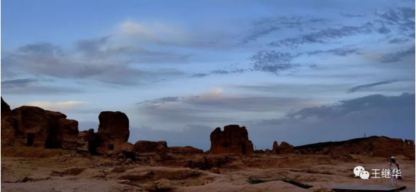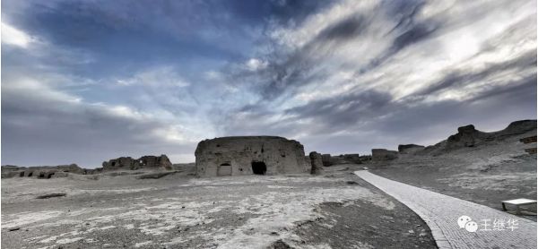 背景的彩霞黑云混合成放射性的霞光,很好的映襯了故城的蒼涼,凄楚,古樸,遠久的前景,達到天城合一。