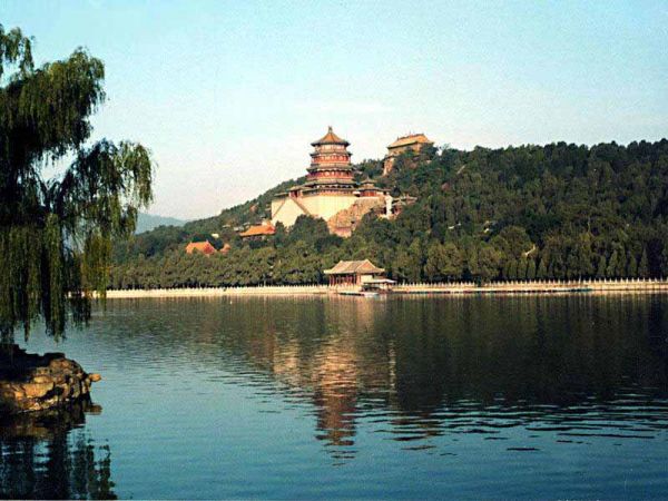 頤和園前山的正中,是一組巨大的建筑群,自山頂?shù)闹腔酆#聻榉鹣汩w、德輝殿、排云殿、排云門、云輝玉宇坊,構成一條明顯的中軸線。在中軸線的兩邊,又有許多陪襯的建筑物。順山勢而下,又有許多假山隧洞,游人可以上下穿行。 頤和園的后山,其設計格局則與前山迥然而異。前山的風格是宏偉、壯麗,而后山則是以松林幽徑和小橋曲水取勝。頤和園的大門稱為東宮門。以東宮門內的仁壽殿為中心的一組建筑物,是當時的政治活動區(qū)。仁壽殿原名勤政殿,是皇帝坐朝聽政的大殿。慈禧、光緒曾多次在此召見群臣,接待外國使節(jié)。現(xiàn)在央部還保存著清代的原來陳設。展前陳設的銅龍、銅鳳、銅鼎等,雕制均極精美。仁壽殿之北,有一組戲園建筑。為德和園、頤和園,古代各種建筑形式應有盡有。在頤和園里,幾乎集中了所有古代建筑的形式,亭臺樓閣、殿堂廳室、廊館軒榭、塔舫橋關,應有盡有,除了木建筑以外,還有銅鑄、石砌、琉璃鑲嵌等。主要建筑有:佛香閣,高41米,建筑在20米高的石造臺基上,氣勢宏偉,據(jù)說這座巨大的建筑物被英法聯(lián)軍燒毀后,1891年重建,花了78萬兩銀子,是頤和園里最大的工程項目。登上佛香閣,周圍數(shù)十里的景色盡收眼底。