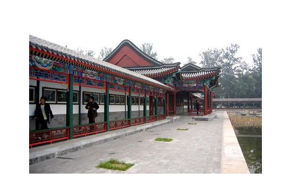 繞到仁壽殿后,便是慈禧、光緒及其后妃居住的生活區(qū)。這是一組用五六十間游廊聯(lián)綴起來的三座大型四合院。其中慈禧居住的樂壽堂,前臨昆明湖,背倚萬壽山,東有德和園大戲樓的襯托,西接長廊入口,是生活居住區(qū)的主體。樂壽堂陳設華麗,有用珍珠瑪瑙和翡翠制成的魚桌等等。仁壽殿南側是光緒居住的玉瀾堂。玉瀾堂的后院是光緒皇后居住的宜芳館。這三座庭院里都種植著奇花異卉,尤以樂壽堂前的十數(shù)棵玉蘭最為名貴。樂壽堂和玉瀾堂內部按當年帝后生活原狀陳列,陳列物是原物。玉瀾堂兩側配殿內有一道磚墻,是一八九八年戊戌變法失敗后,慈禧增筑用來幽禁光緒的。
